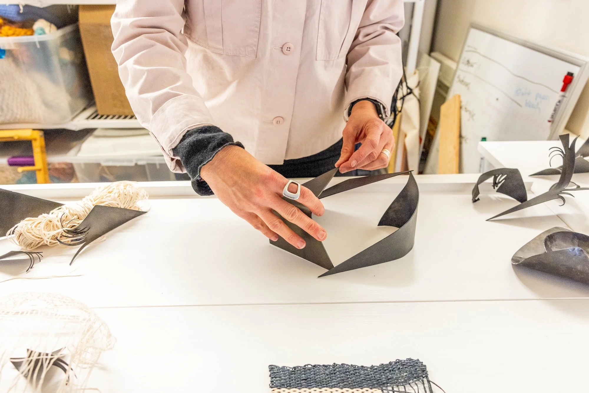 I find that I am more interested in questions than answers. Each bit of work I make is unique, asymmetrical, imbued with gesture and occasional moments of humor. My years as a dancer are ever present as I design, abandon, calculate, skew, thread, tie, hammer, weave and unweave. Every arrangement is temporary. The materials I work with satisfy my tactile and kinesthetic senses. I choose them because of how they feel, how they move. My aim is to spark kinesthetic curiosity.